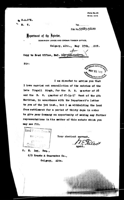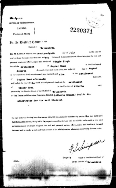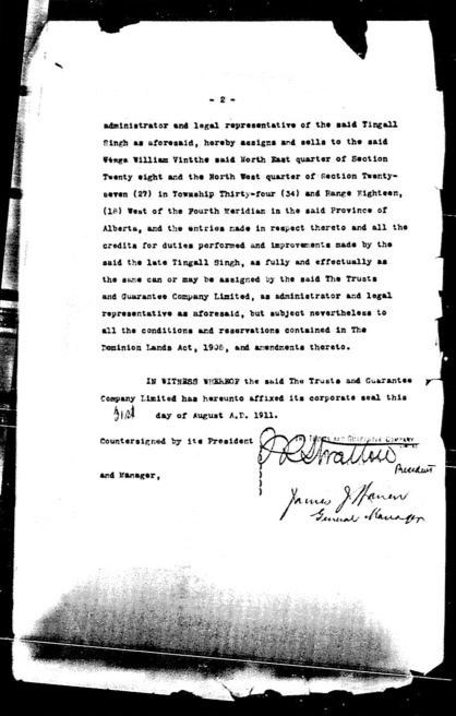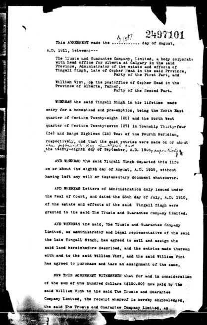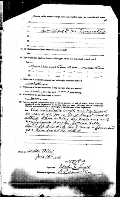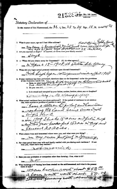 Chainchal (Tengull, Tingle, Tingall) Singh, Homestead pre-emption, Calgary, Stettler, 1908