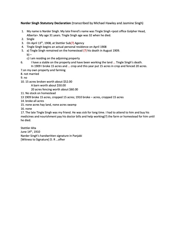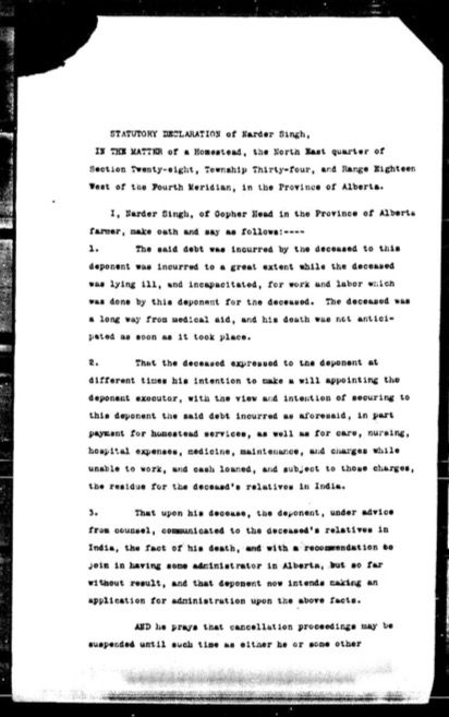 Narder Singh, Statutory Declaration File, Stettler, 1910 (including William Vint documents 1911 and 1912)